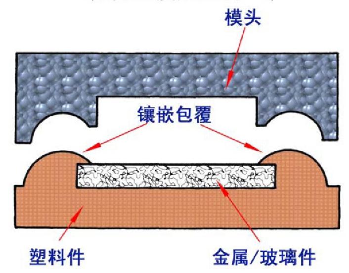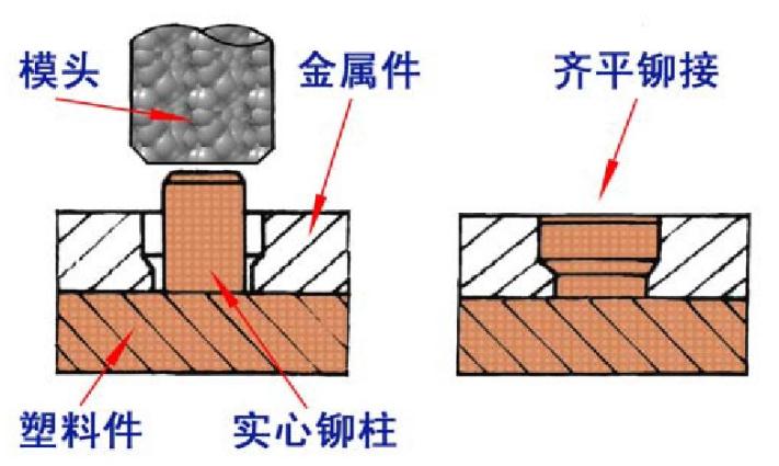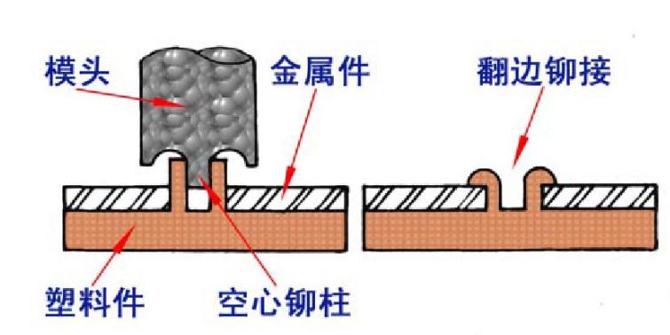 金属与塑胶铆接原理:塑胶件上的塑料柱,穿过金属件的孔,热熔头(热熔铆接)/超声波焊头(超声波铆接)将塑料柱突出部分熔融,按照设计的铆接形状变成铆钉形状,使金属与塑胶材料机械铆接在一起,将金属板固定住。金属与塑料热铆接组装是简单、低廉、高效、简易的性固定装配的有效方法。在型模作用下延展再成型,多点同时进行铆接固定,无须外加零部件、填料和其它费用,热塑性材料依此方法装配牢固、紧固又坚固。简而言之,组件上的所有各个紧固部位同时加热塑化,然后用激冷模头施压后使其延展变形、冷却成形铆固,许多部件组合成牢固的整体组件,事实证明优于其它常用的传统方法,无须其它填充材料,明显减少材料消耗、降低成本。