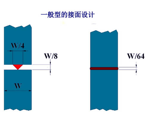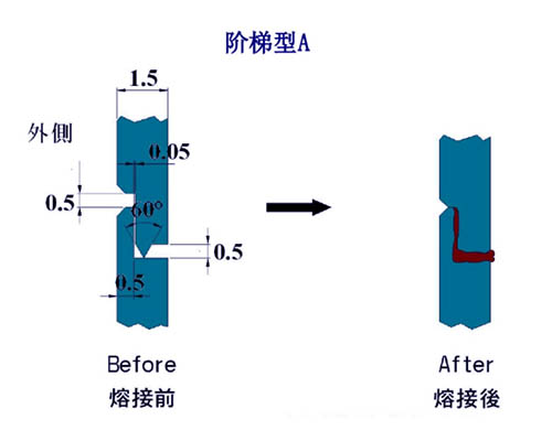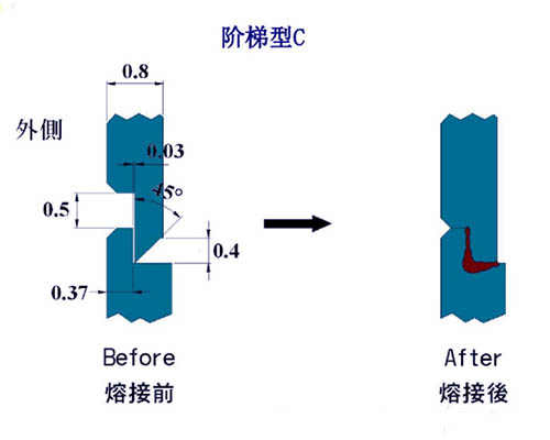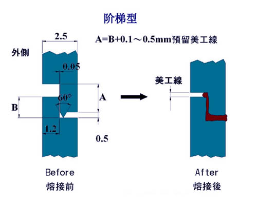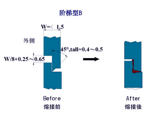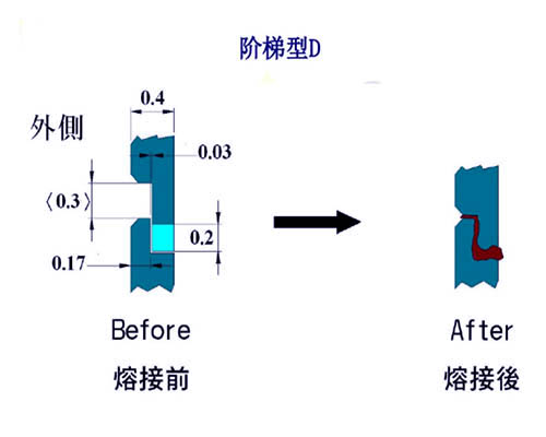 阶梯尖式:适合水密性及防止外凸或龟裂之方法,接触面的角度= 45°,x=w/2,d=0.3~0.8mm为佳。