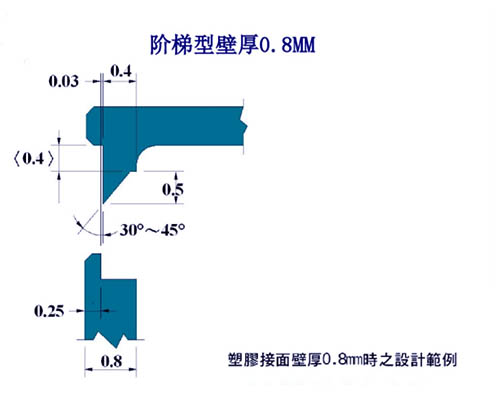 斜 切 式 :适合水密性及大型产品之熔接,接触面角度 =45°, x=w/2,d=0.3~0.8mm为佳。