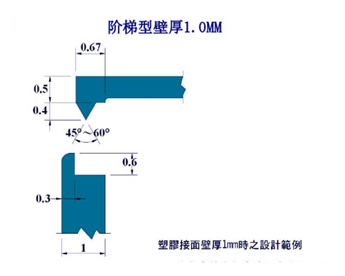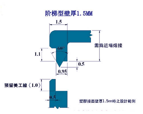 欲求产品达到水、气密的功能时,定位与超声波导熔线是成败的重要关键,所以在产品设计时的考虑,如:定位、材质、肉厚,与超声波导熔线的对应比例有的关系。在一般水、气密的要求,导熔线高度应在 0.5~0.8m/m 之范围(视产品肉厚而定),如低于0.5m/m以下,要达到水气密的功能,除非定位设定要非常标准,而且肉厚有 5 m/m 以上,否则效果不佳。