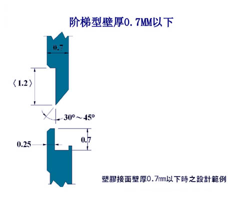 峰谷尖式:适合水密性且高强度熔接,d=0.3~0.6mm 内侧接触面之高度 h 依形状大小而有变化,但 h 约在1~2mm左右