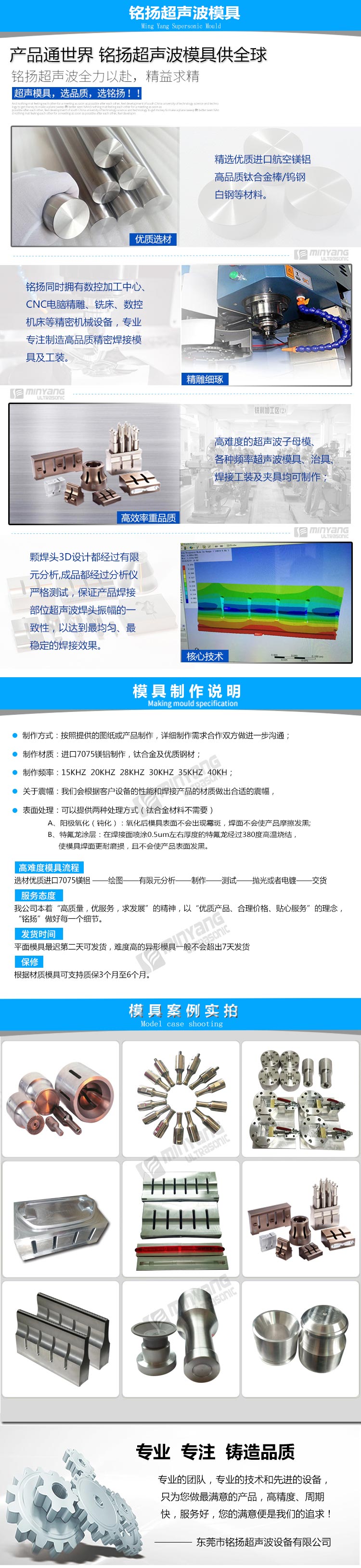 铭扬专业制造各种超声波模具焊头,点焊铆焊焊头,铝合金模,钛合金模,子母焊头。特别擅长制作各种高难度、精密模具。我们制作的焊头设计时都是经过有限元分析,制成品都经过严格测试,保证每套模具都精密、可靠、耐用。